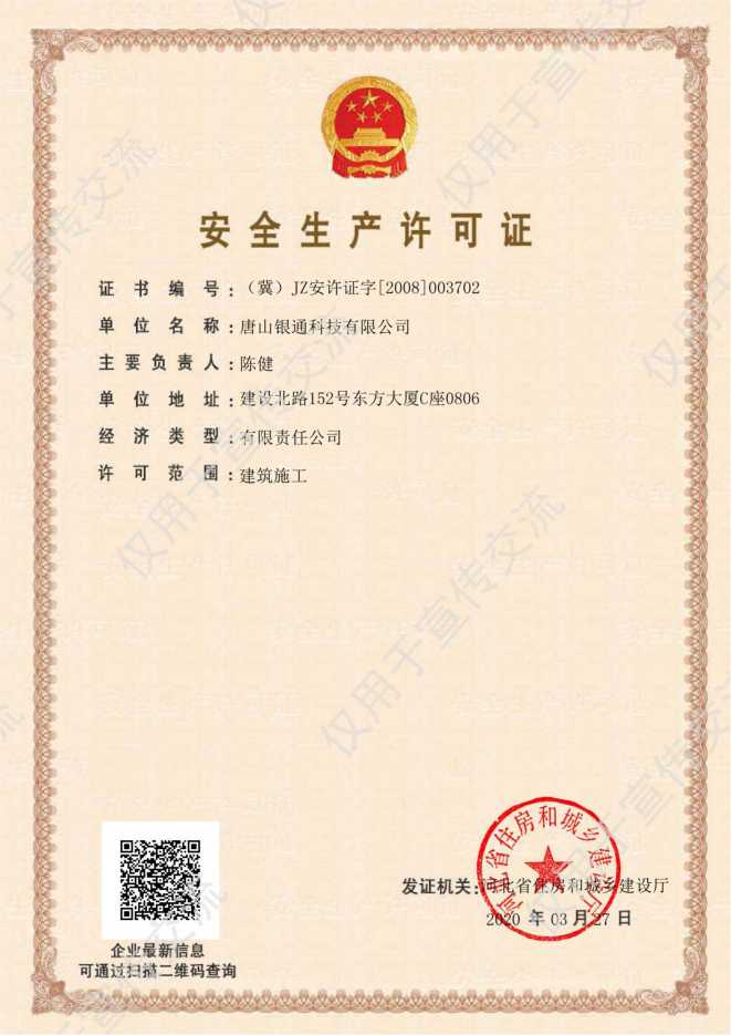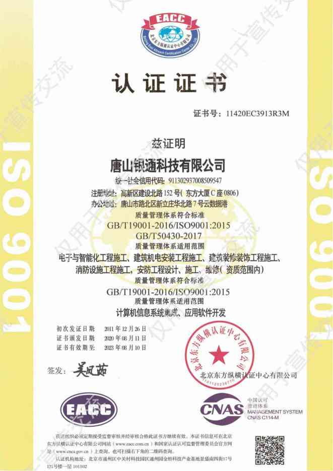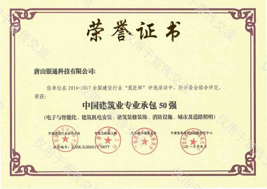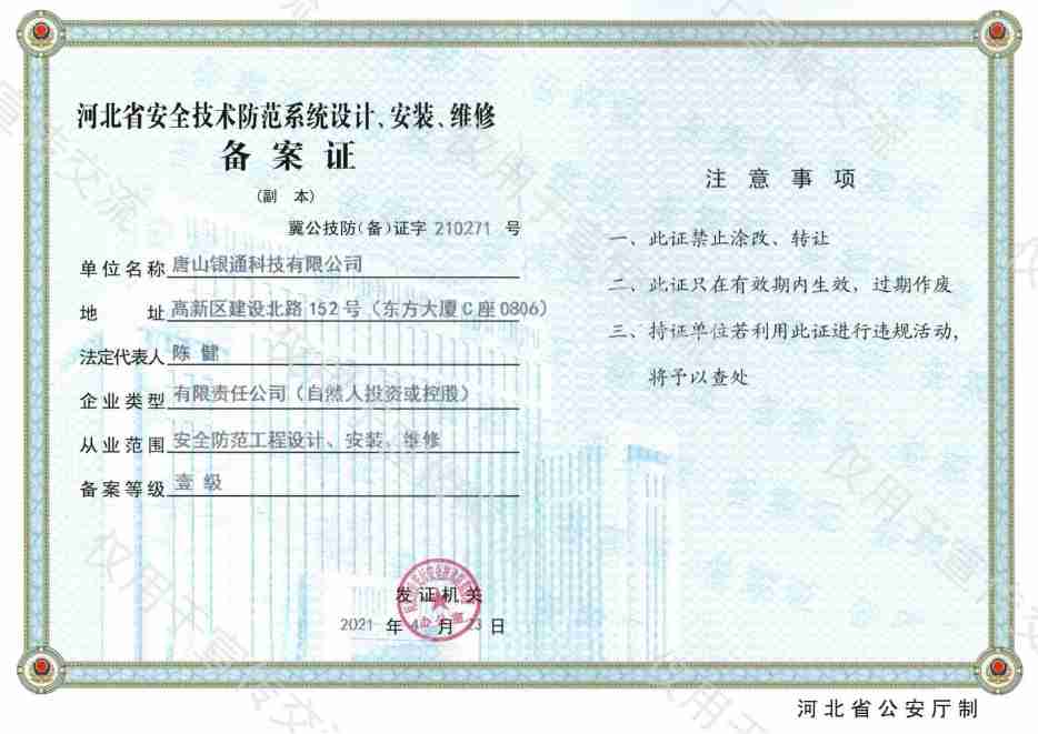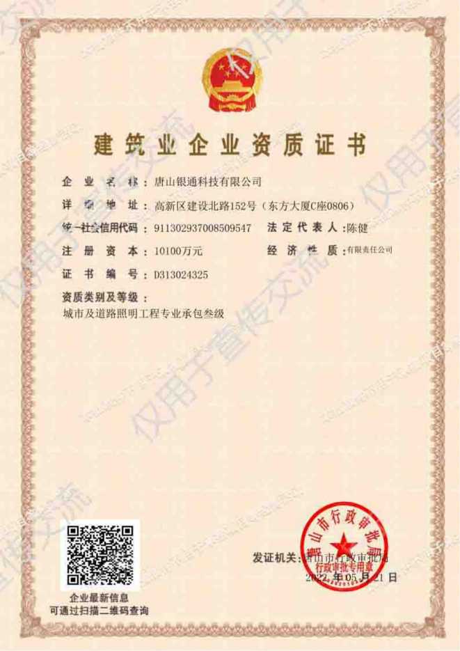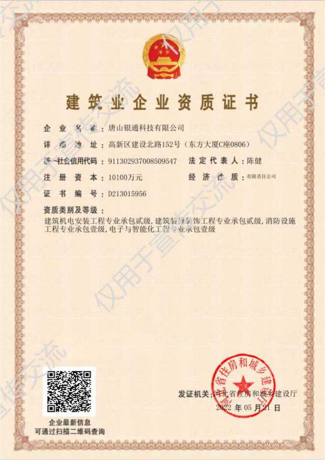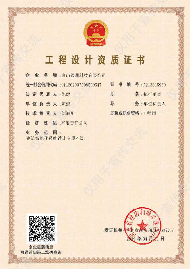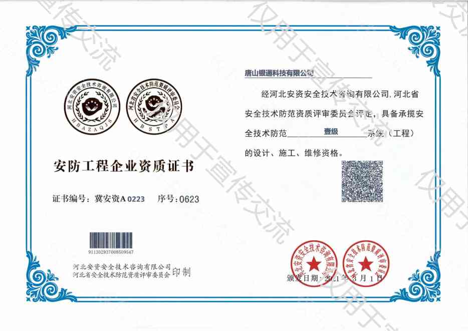 公司已取得電子工程與智能化工程專業(yè)承包一級資質,消防設施工程專業(yè)承包一級、安全防范一級資質,建筑機電設備安裝工程專業(yè)承包貳級資質,建筑裝飾裝修工程專業(yè)承包貳級資質,城市及道路照明工程專業(yè)承包叁級,建筑智能化系統(tǒng)專項設計資質、2018年通過高新技術企業(yè)。安全生產許可證書,系統(tǒng)集成三級資質。榮獲“高新技術企業(yè)”“河北省安防范系統(tǒng)工程設計施工維修優(yōu)秀工程商”、“河北省優(yōu)秀科技企業(yè)”、“守合同重信用企業(yè)”、“售后服務有保障單位”、“AAA級信用企業(yè)”等多項榮譽和稱號,是河北省安防協(xié)會副理事長單位、中國演藝設備會員單位、中國石油入網會員單位。